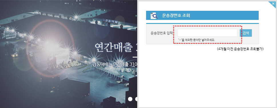 경동택배 홈페이지 중간에 보시면 운송장 조회 메뉴가 있습니다. 운송장조회 버튼을 클릭하시면 운송장 번호 입력란에 문자만 넣으시고 조회하시면 간편하게 조회됩니다.