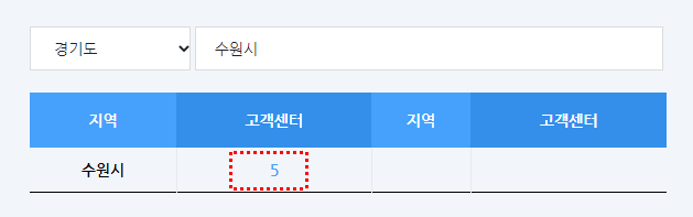 메뉴 버튼에서 고객센터 찾기 버튼을 클릭하신 후 본인이 사시는 지역을 클릭하시면 됩니다.