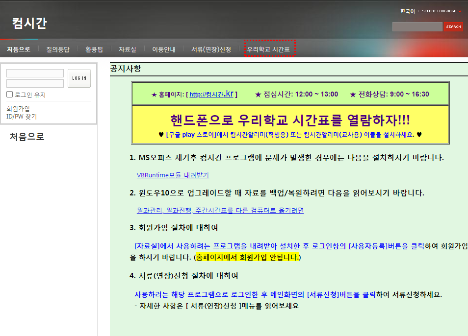 컴 시간 홈피 화면인데요 학생들은 우리 학교 시간표만 보시면 될 것 같아요.