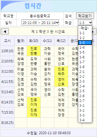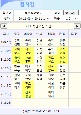 컴 시간 홈피 화면인데요 학생들은 우리 학교 시간표만 보시면 될 것 같아요.