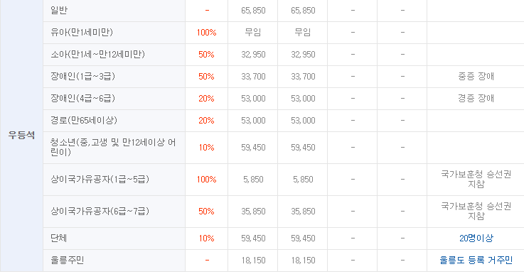 일반 기준 출항, 입항 60,000원 유아(1세 미만) 무료, 소아는 50% 할인,
