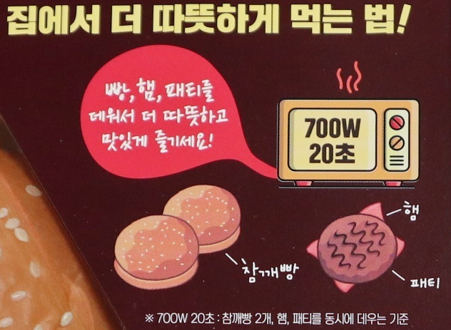 집에서 먹을 때는 참깨 빵, 햄, 패티를 전자레인지 넣고 20초 후 먹으면 더 맛난다고 하네요.