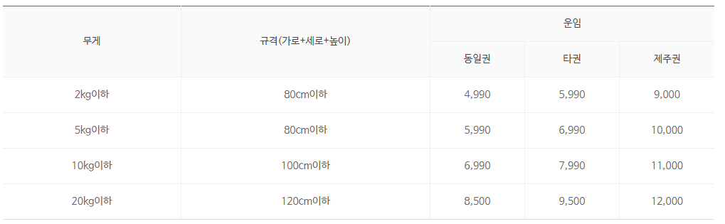 홈택배 이용 시 무게는 20kg 이내 물품이며, 무게와 박스 규격 초과하면 할증요금이 발생합니다.