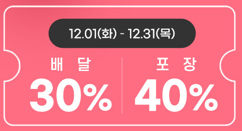 - 행사기간은 12월 1일~12월 31일(배달 30%, 포장 40%) 까지며 ,