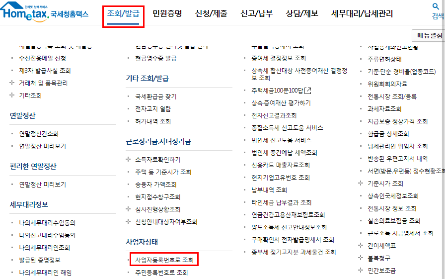 홈택스 조회/발급 ▷▶ 사업자 상태 ▷▶ 사업자등록번호 조회 클릭