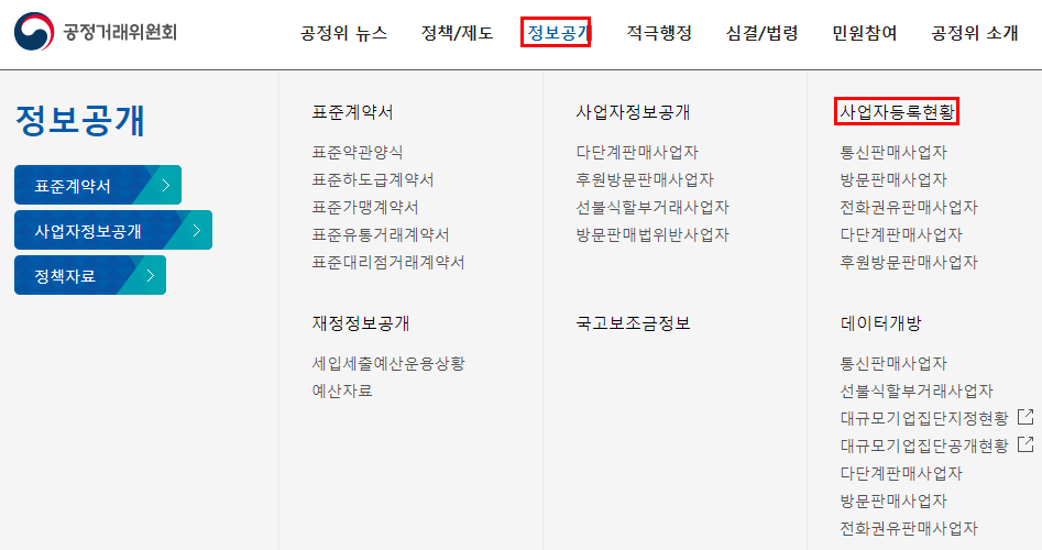 공정거래위원회 사업자등록번호조회 통신판매업, 방문판매업, 전화권유 판매사업자 등을