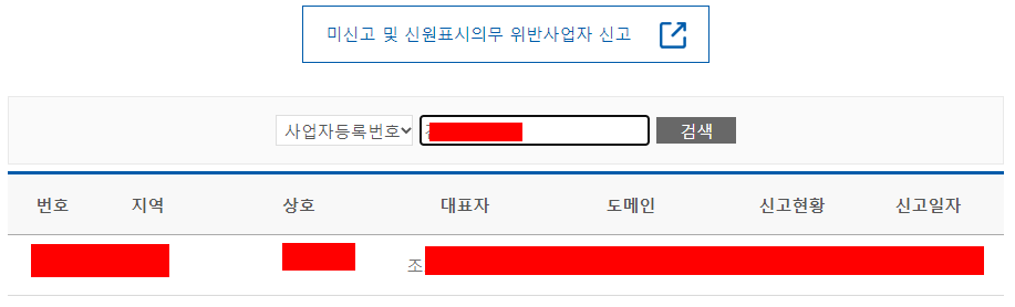 사업자등록번호 입력 후 검색하시면 상호, 대표자명 도메인 등이 표시됩니다.