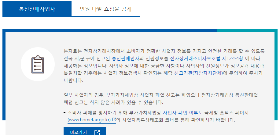 또한 사업자간, 소비자의 거래에 있어 과세사업자, 폐업 사업자인, 통신판매업 하는 사업자인 미리