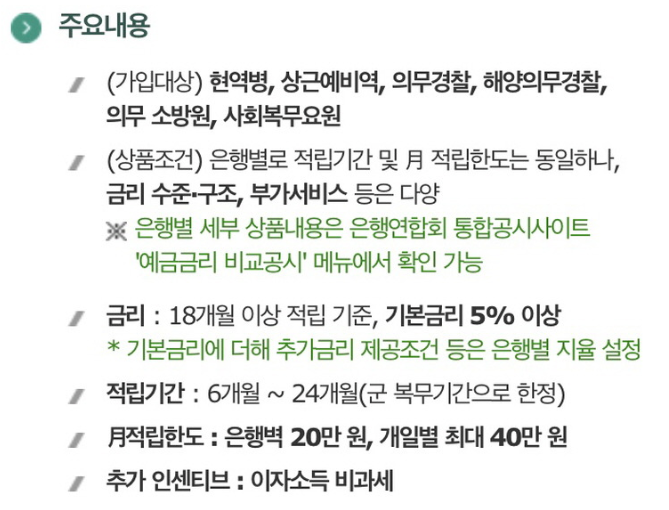 가입대상은 현역병, 상근예비역, 의무경찰 등이 가능하며 18개월 이상 적립기준으로 기본 금리 5% 또한 은행별 추가 금리도 제공, 이자소득 비과세 이므로 퇴역할 때 목돈 마련해서 좋을 것 같네요.