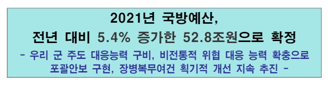 2021년 국방예산은 전년 대비 5.4% 증가한 52.8조 원으로 그 내용 중 장병 복무여건 획기적 개선 지속 추친 이라고 있네요.
