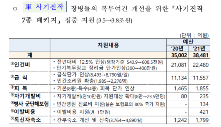 *기존 국방 기회 안에는 2021년 인상은 업었는데요(2018년, 2020년, 2022년) 단계적 인상 계획였으나 코로나 때문인지 군 사기를 위해서 1년 앞당겨서 올린 듯해요.