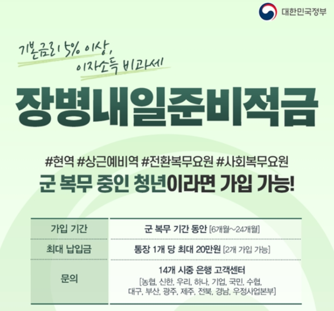 가입대상은 현역병, 상근예비역, 의무경찰 등이 가능하며 18개월 이상 적립기준으로 기본 금리 5% 또한 은행별 추가 금리도 제공, 이자소득 비과세 이므로 퇴역할 때 목돈 마련해서 좋을 것 같네요.
