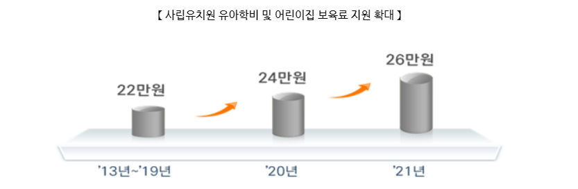 국공립유치원 유아학비 지원금은 6만 원에서 2021년 8만 원으로 인상.