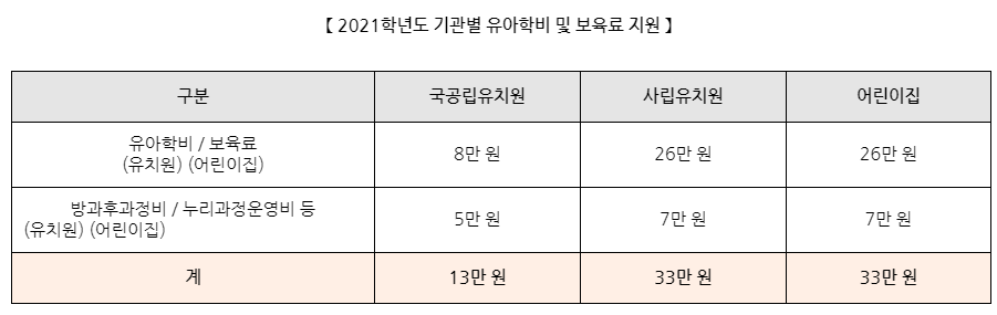 2021년 보육료 및 유아학비 지원금액.