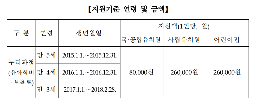 ▶ 국공립유치원, 사립유치원, 어린이집 누리과정(유아학비, 보육료) 연령.