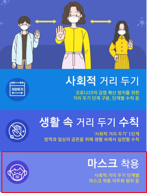 사회적 거리 두기 단계별 마스크 착용 의무화 범위를 알수 있는 탭입니다.