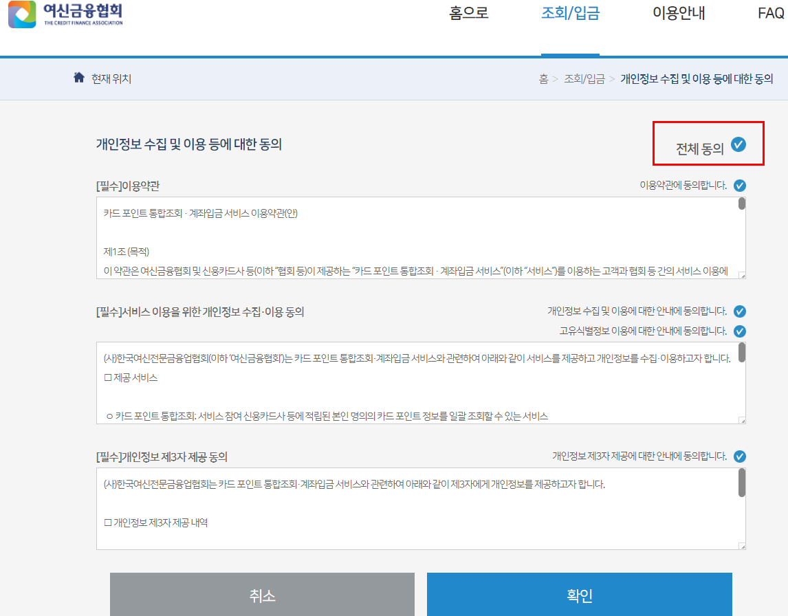 여신금융협회 카드통합조회 이용동의
