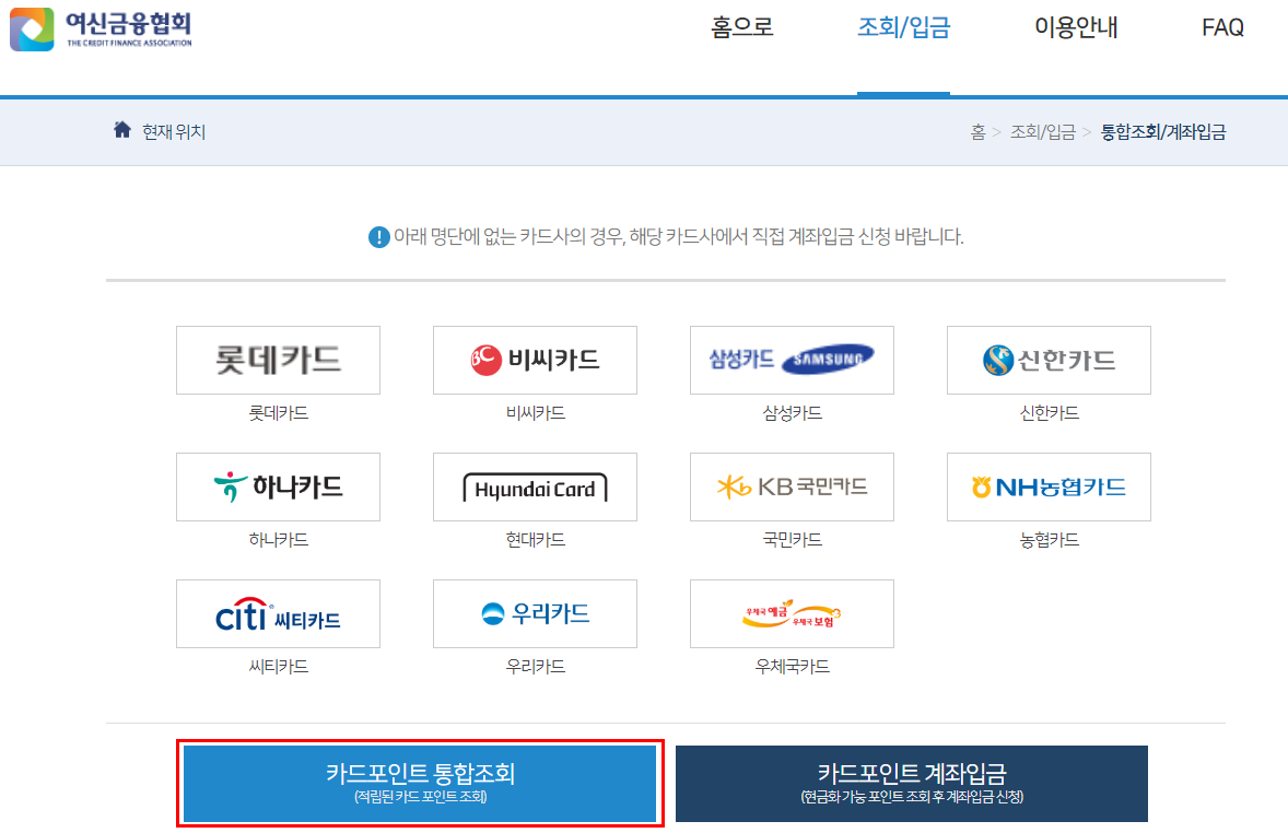 여신금융협회 카드포인트 통합조회계좌입금