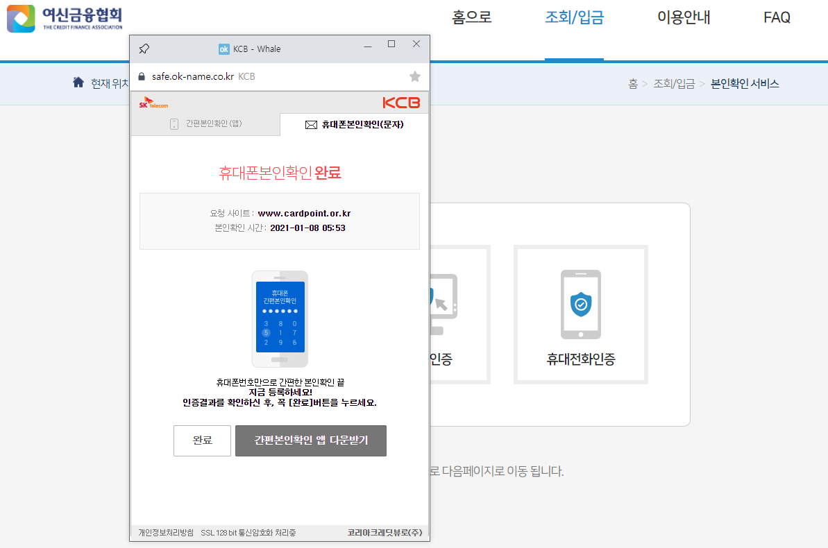 카드포인트 보인인증완료 화면