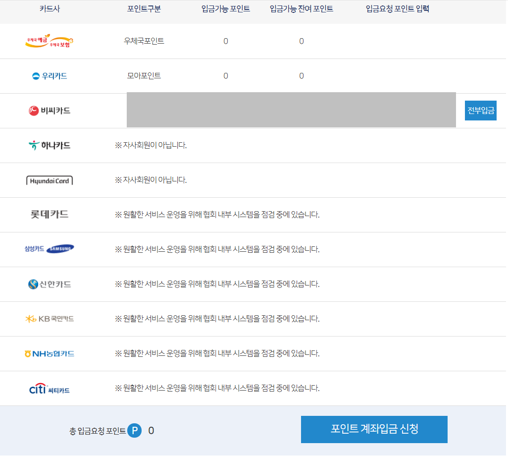 본인이 사용하시는 카드사 포인트(예를 들면 우체국 포인트, 우리 카드, 삼성카드)등 사용 가능 포인트 및 입금 가능 포인트가 나옵니다. 포인트 입력 후 포인트 계좌입금 신청하시면 됩니다.