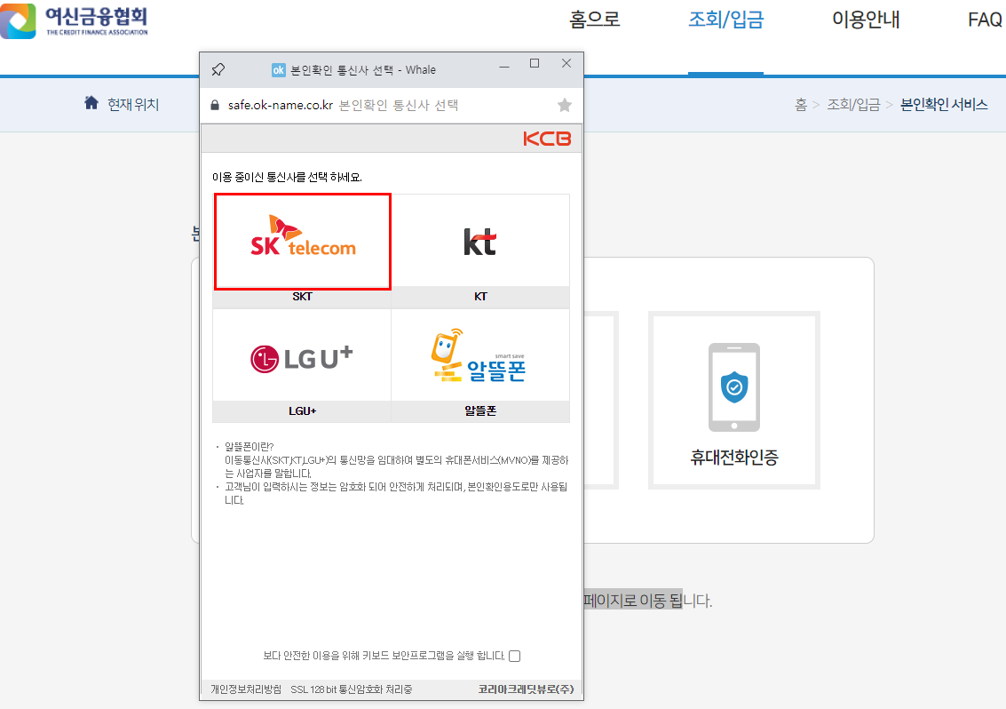 본인이 사용하시는 통신사 중 선택(전 SK텔레콤) 선택 후 보안 프로그램 실행 클릭하시면 됩니다.