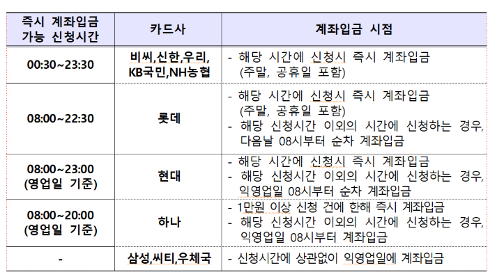 해당 시간에 신청 시 즉시 계좌입금(주말, 공휴일 포함)