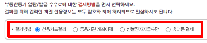 부동산등기 열람발급수수료 결제방법화면
