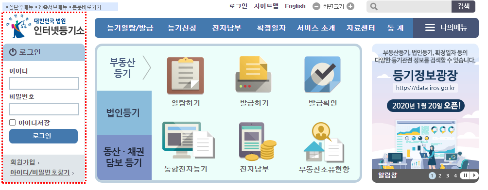 처음 방문하신 분이라면 회원가입을 하셔야 등기부등본 인터넷발급 및 전자 납부등 서비스를 이용하실 수 있습니다.