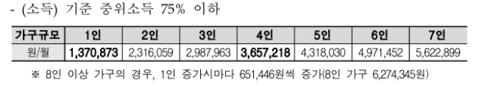소득기준은 중위소득 75% 이하, 1인 가구 1,370,873원, 2인 가구 2,316,059원, 3인 가구 2,987,963원, 4인 가구 3,67,218원입니다.