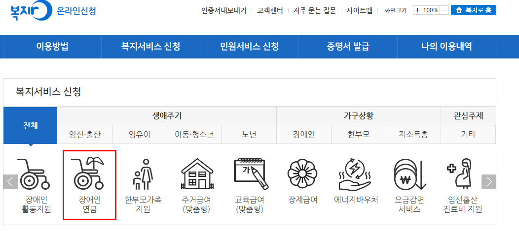 장애인 연금 탭 클릭 신청 하시면 됩니다.