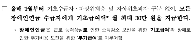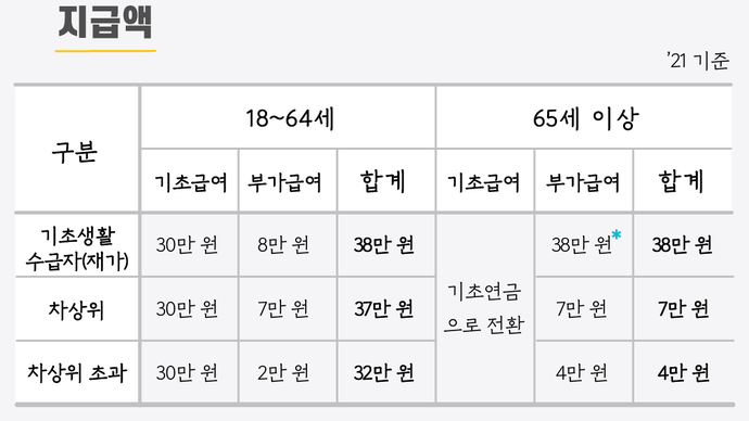 65세 이상 중증장애인 국민기초연금 수급액에 부가급여로 추가 지급합니다.