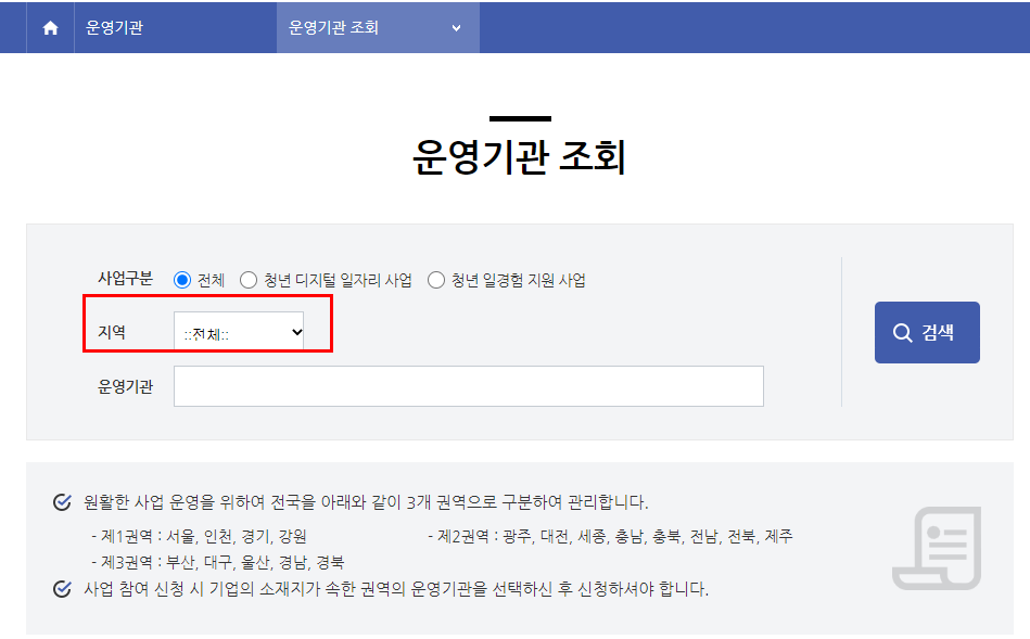 사업장 소재지 지역 선택 후 검색하시면 운영기관에 대한 정보를 보실 수 있습니다.(전화번호, 위치 등)