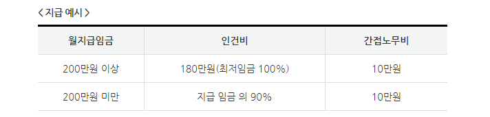 월 인건비가 2,000,000원 미만인 경우 월급의 90% 지원, 노무비는 같음.