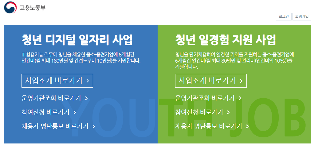 고용노동부 청년 일자리 채용계획 2021년 1월 1일부터 2021년 12월 31일까지 채용된 인원에 한하여 지원합니다.