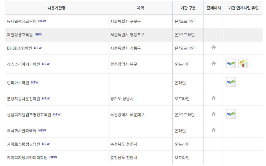 사용기관 안내 검색에서 옵션별로 검색이 가능하므로 본인이 원하는 수강을 검색하신 후 신청하시면 됩니다.