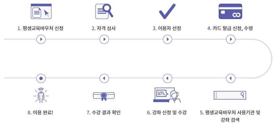 바우처 신청 → 자격심사 → 이용자 선정 → 카드 발급 신청, 수령 → 사용기관 및 강좌 검색 수강 신청.