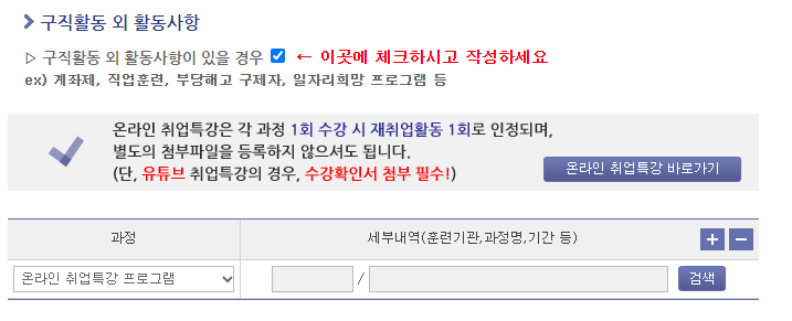 구직활동 외 활동사항이 있을 경우 체크 → 온라인 취업특강 바로가기 클릭.