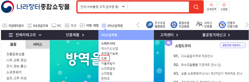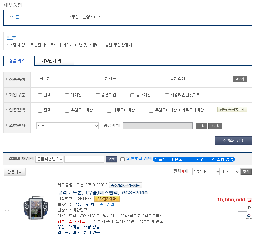 드론 규격, 식별번호, 원산지, 우선구매 대상, 납품장소
