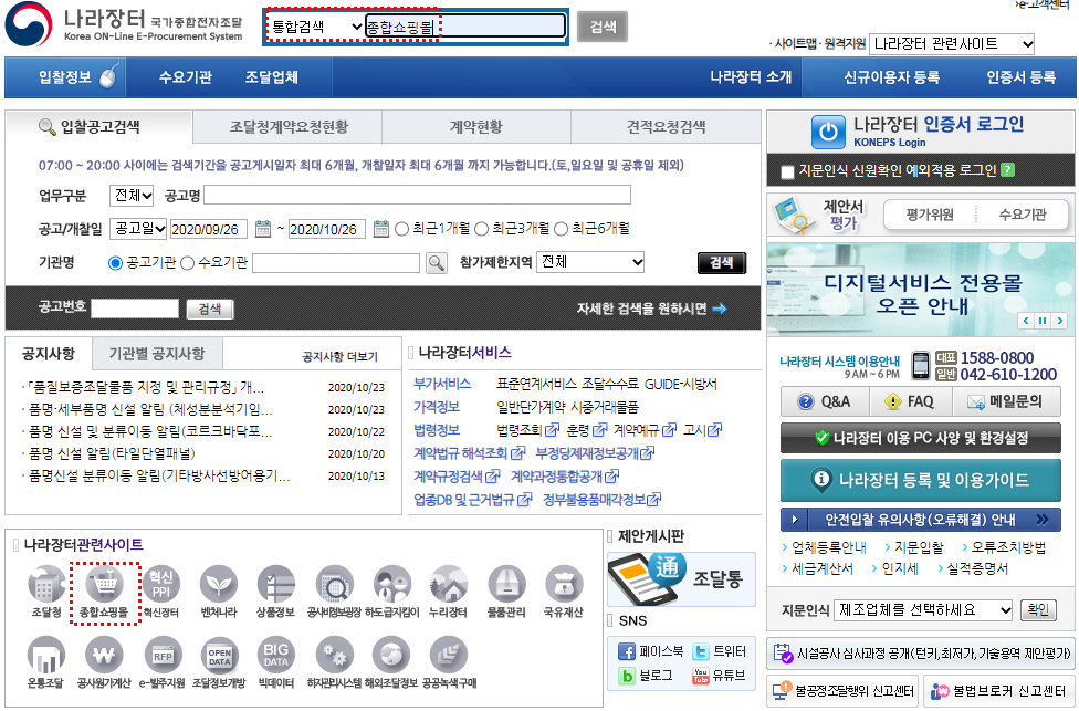 나라장터 메인 페이지에서 종합쇼핑몰 찾는 방법은 두 가지입니다.
