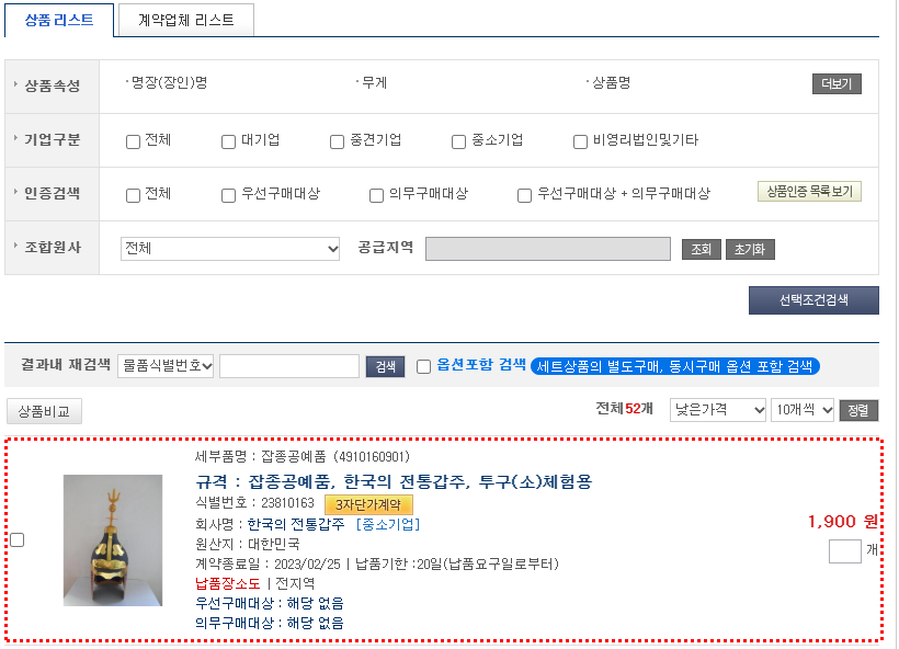 품명:잡 종고 예품, 규격:한국의 전통갑주, 업체명, 물품 식별번호 등을